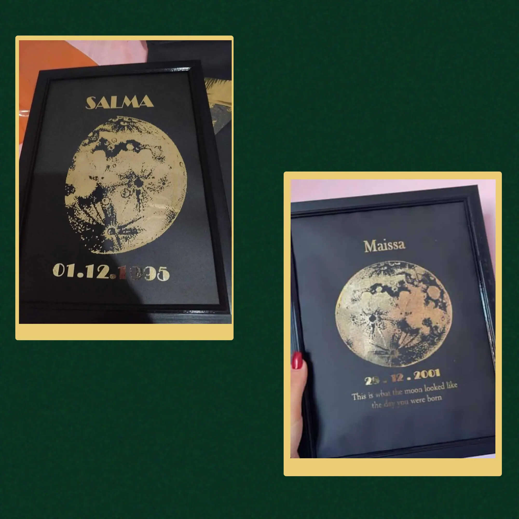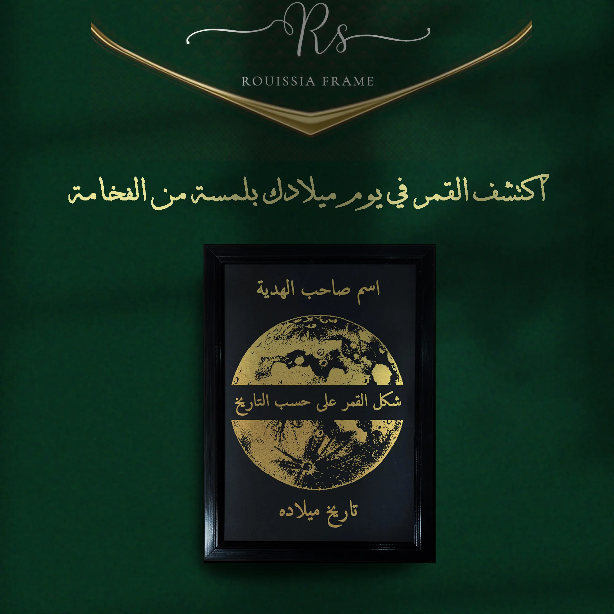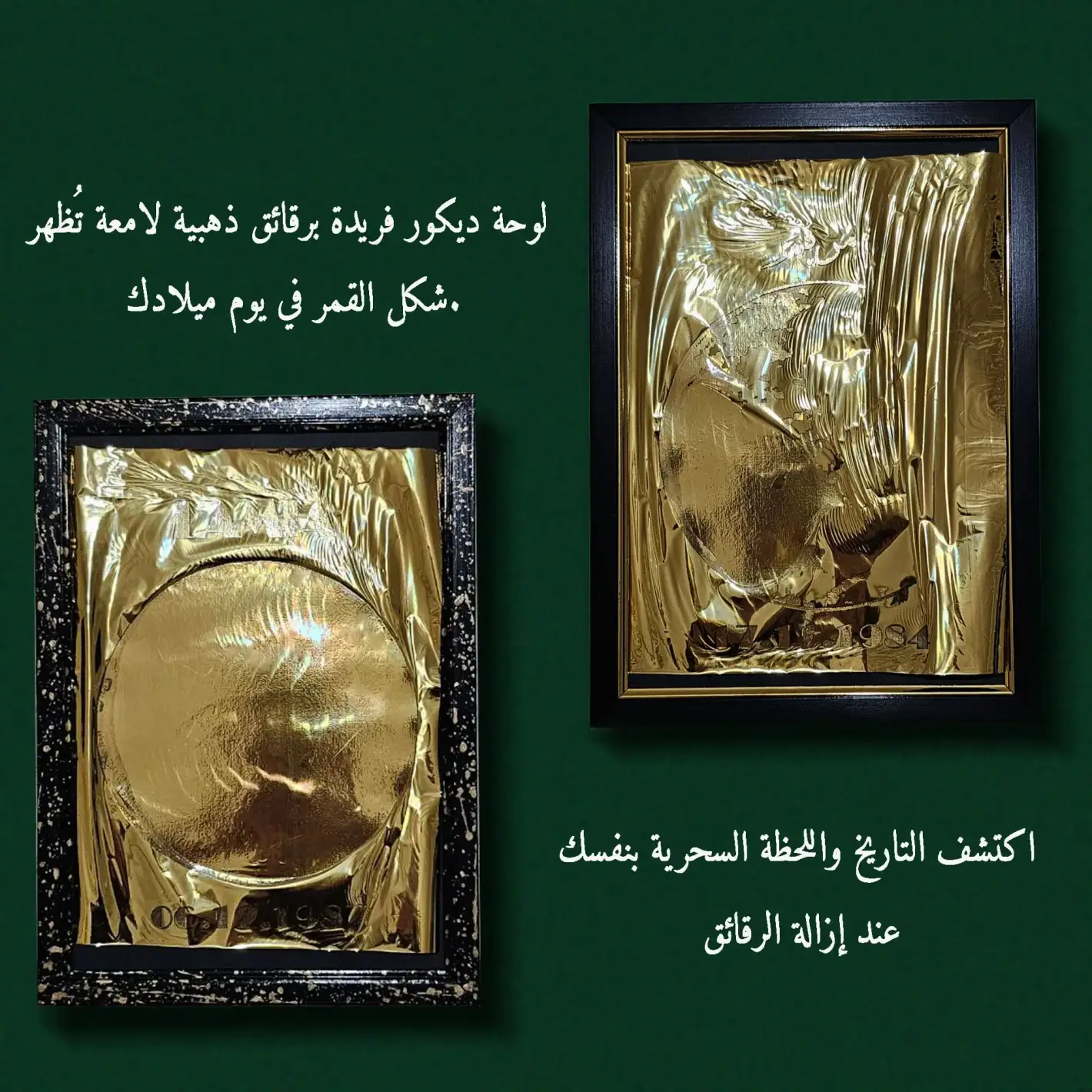 لوحة ديكور فريدة برقائق ذهبية لامعة تُظهر شكل القمر في يوم ميلادك. اكتشف التاريخ واللحظة السحرية بنفسك عند إزالة الرقائق