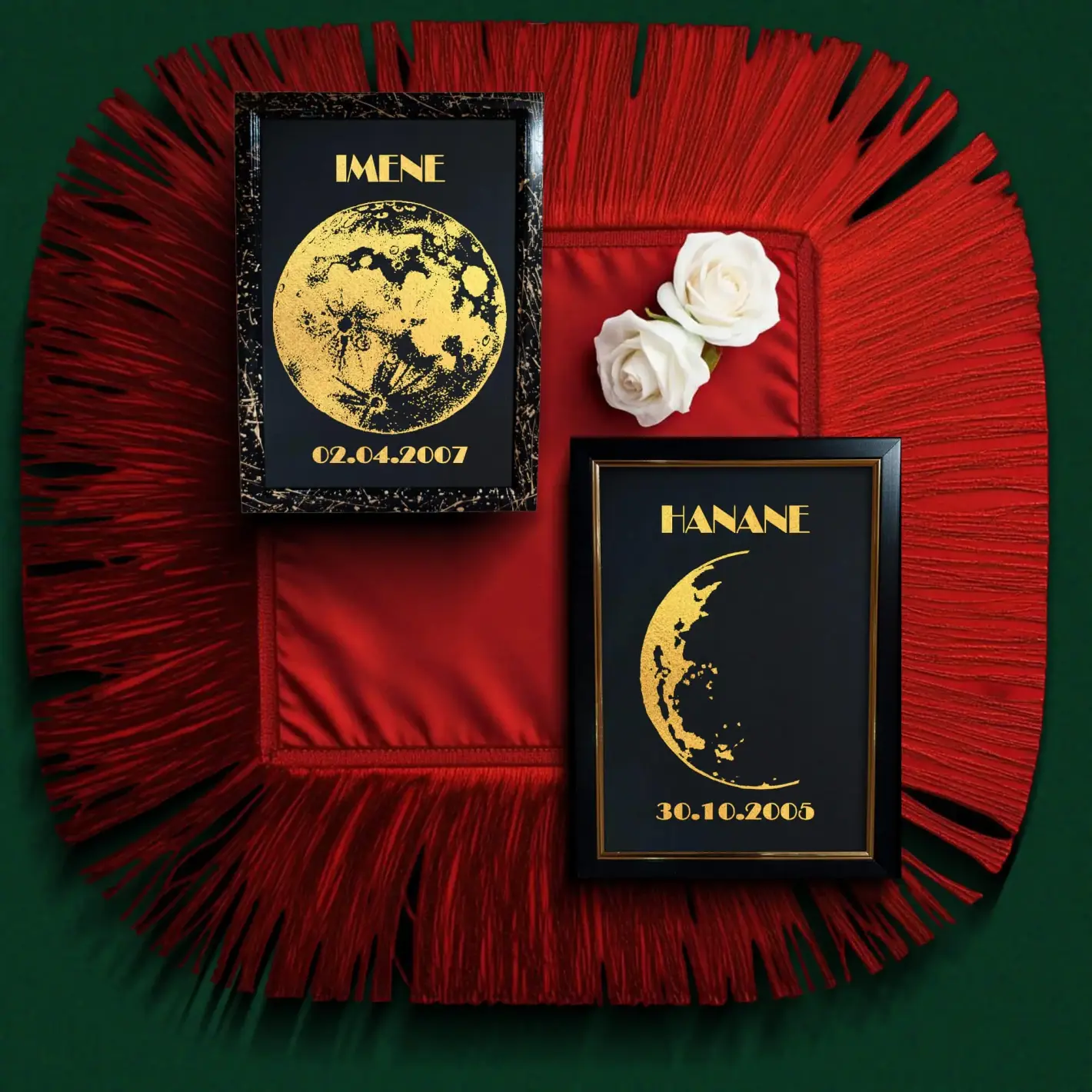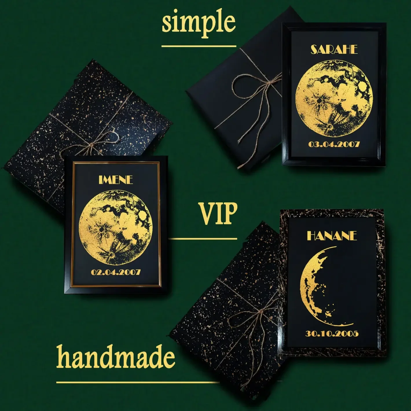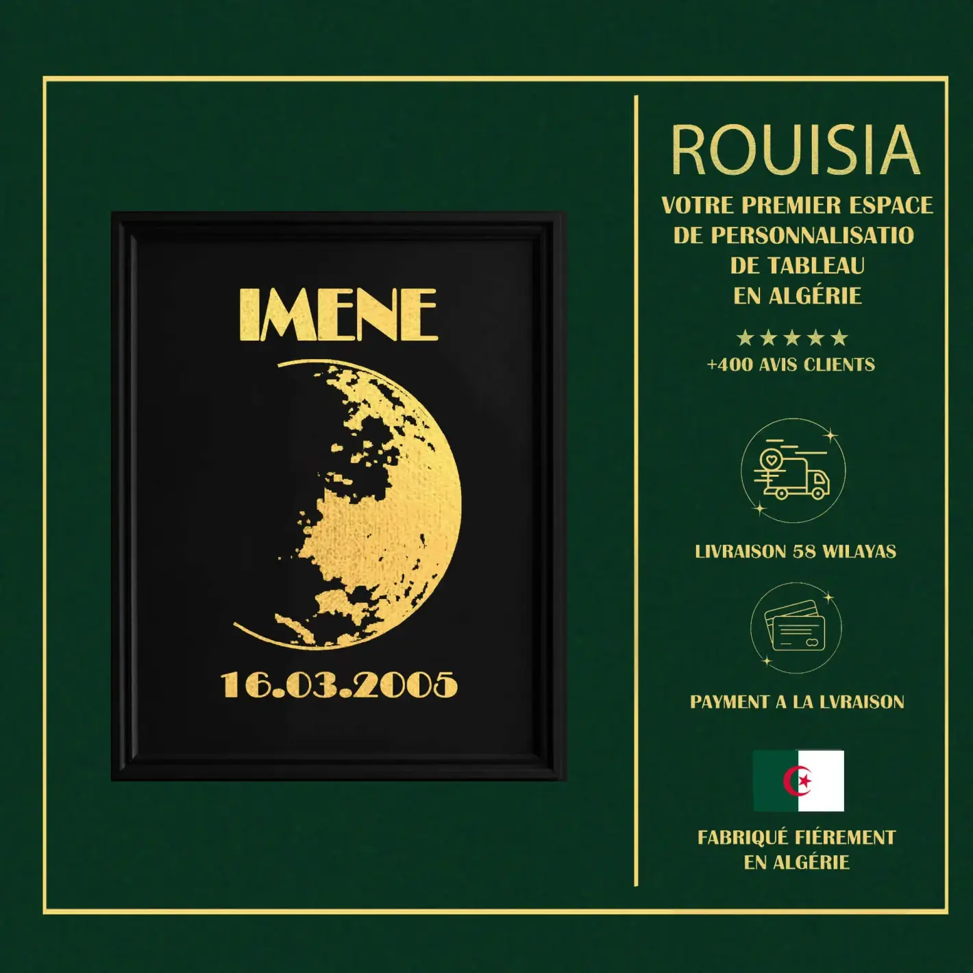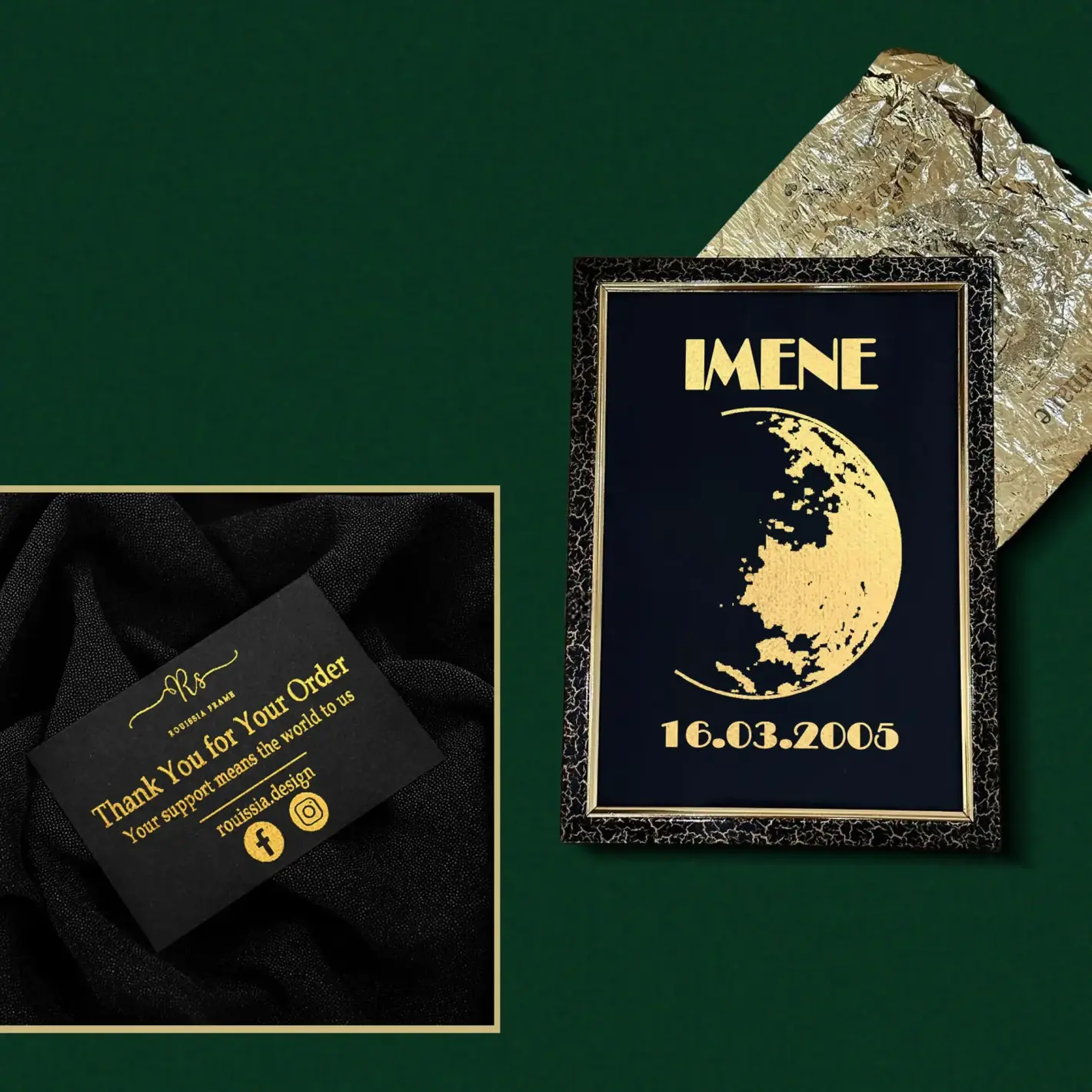 لوحة ديكور فريدة برقائق ذهبية لامعة تُظهر شكل القمر في يوم ميلادك. اكتشف التاريخ واللحظة السحرية بنفسك عند إزالة الرقائق
